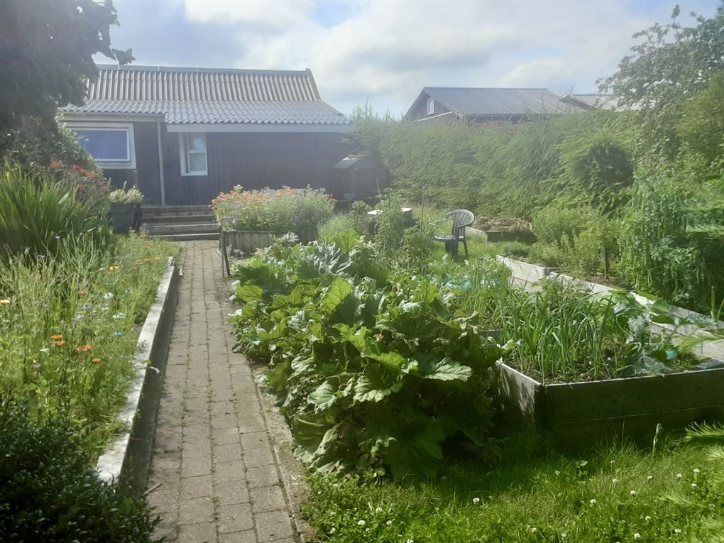 Haven på 423 kvm er frodig og velholdt, og i forlængelse af huset ligger et større skur, der kan bruges både som værksted, vaskerum og til at forspire diverse afgrøder.